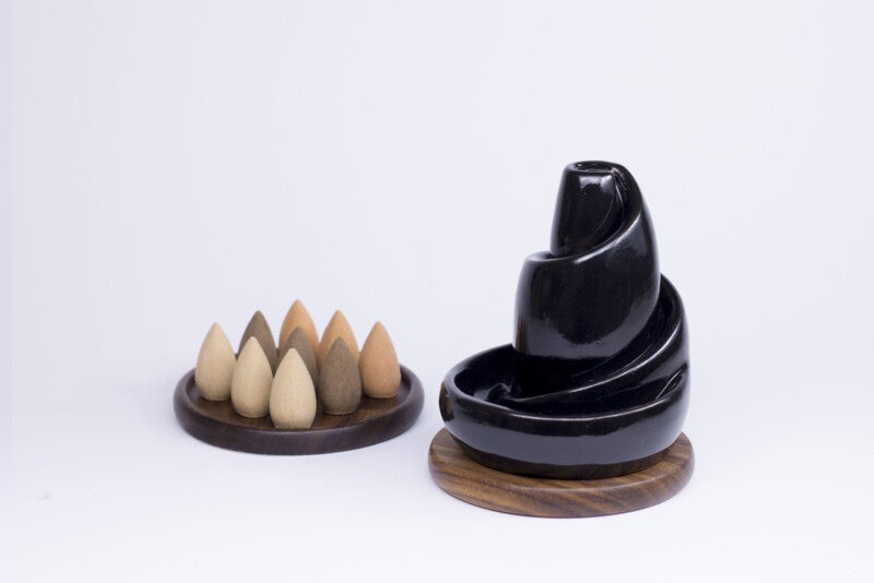 Materiaal: keramiek, notenhout, 9 wierookkegels (sandalwood, agilawood en thujawood)
