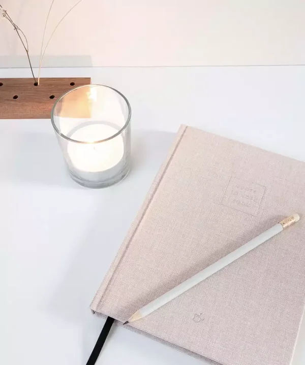 Het notebook heeft een luxe, zachtroze linnen omslag (hardcover) met zilveren zeefdruk. De binnenzijde bevat creatieve kaders die je uitnodigen om in te schrijven, tekenen, kalligraferen of handletteren. Of plak er een quote van een kaart, foto of uit een tijdschrift in.