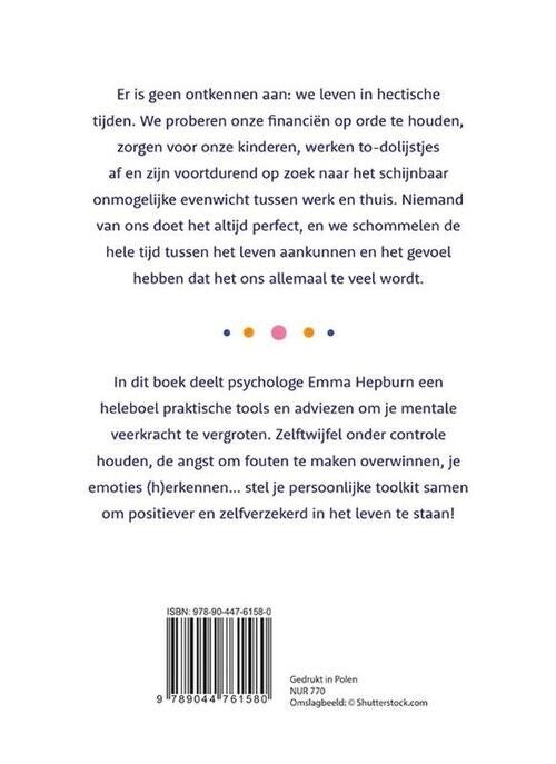 In dit boek reikt psychologe Emma Hepburn een heleboel bruikbare tools en praktische adviezen aan om je mentale veerkracht te vergroten in deze hectische tijden. We proberen allemaal het schijnbaar onmogelijke evenwicht tussen werk en thuis te vinden, jongleren met heel veel ballen tegelijk en hebben vaak het gevoel dat het ons allemaal te veel wordt. Met dit boek stel je je persoonlijke toolkit samen om voor je geest te zorgen en positiever en zelfverzekerd in het leven te staan.