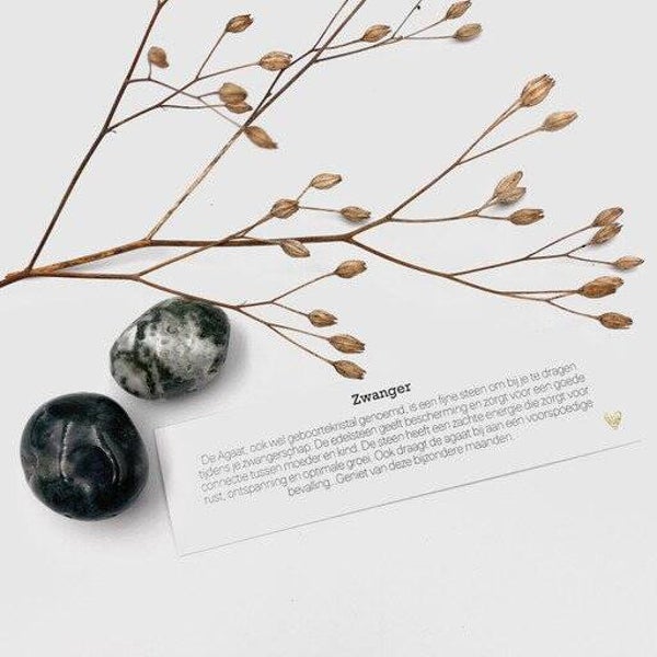Een potje ‘zwanger' met de edelsteen agaat en omschrijving. De Agaat wordt ook wel geboortekristal genoemd. De steen staat symbool voor bescherming en de connectie tussen moeder en kind.