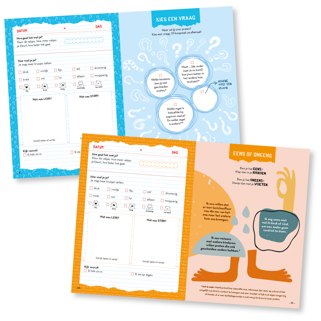 Invulboek voor kinderen van gescheiden ouders. Om lastige onderwerpen bespreekbaar te maken en kinderen te stimuleren om hun emoties te uiten.